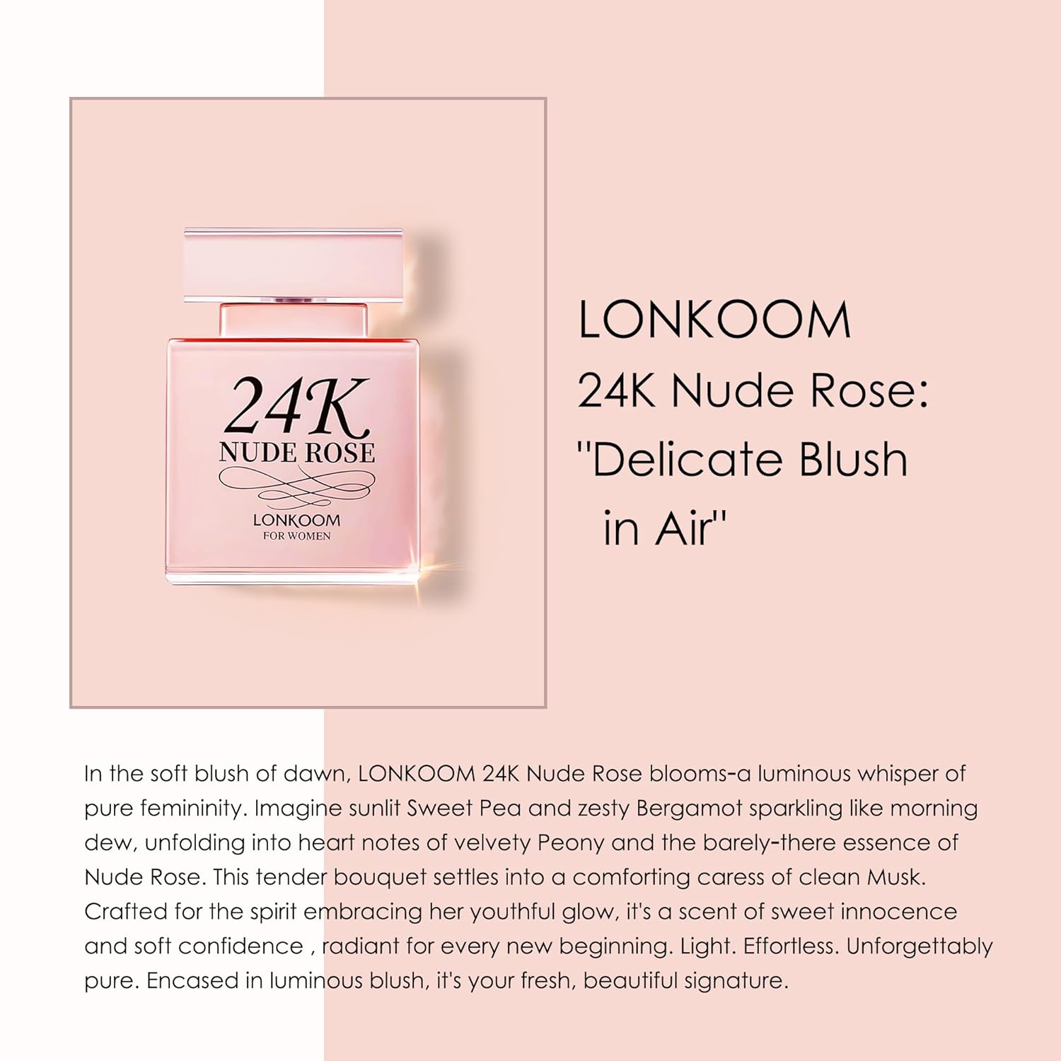 A fruity opening awakens the senses, then gracefully gives way to a blooming heart of peony and rose—an elegant and intelligent floral signature. The fragrance settles into a musk dry-down, capturing an eternally alluring trail.